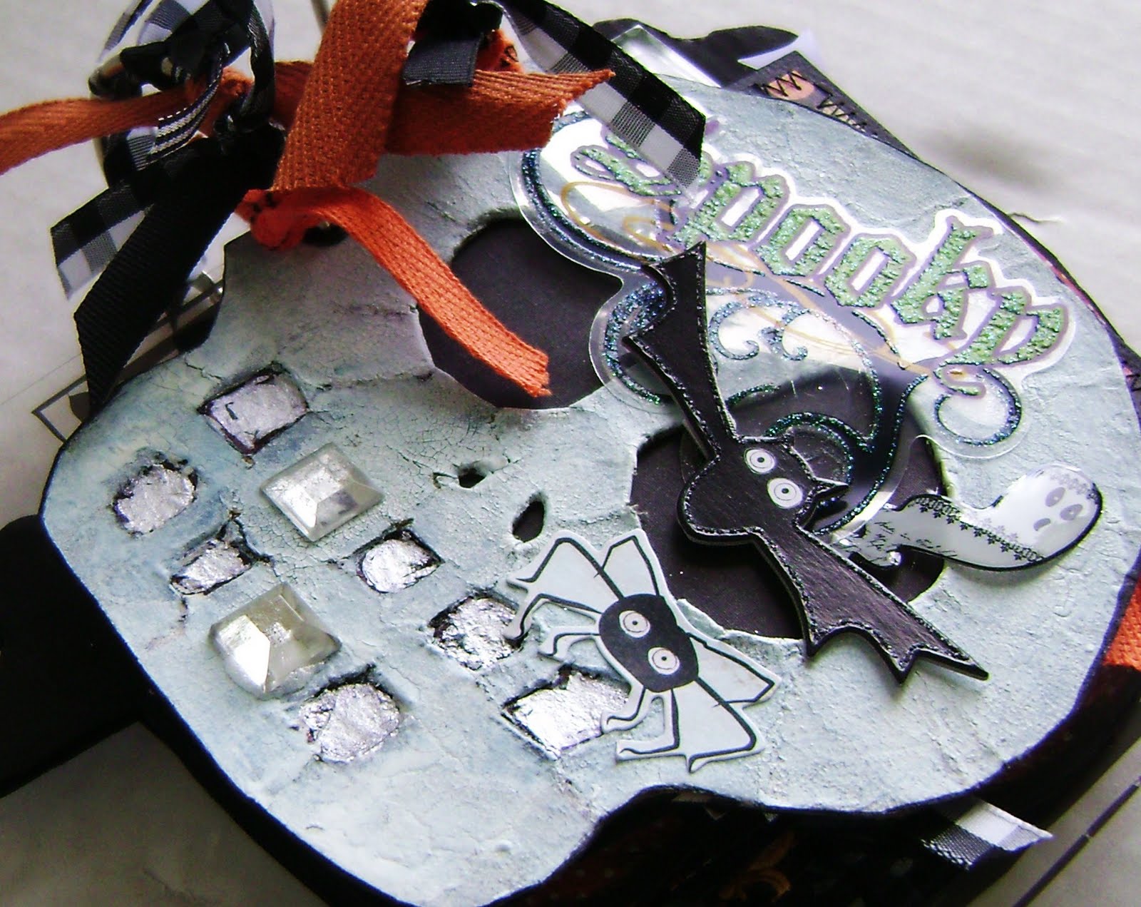 I used a cool chipboard shape from LYB. The pumkin measures almost 6x6. I like it 'cause it was big. I sanded the surface to make it more spooky. I also added an acrylic tag and pin from TH and a cute charm.